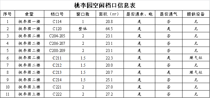 根据食堂实际条件,本次桃李园共引进11个档口,相关信息和位置详见下表。